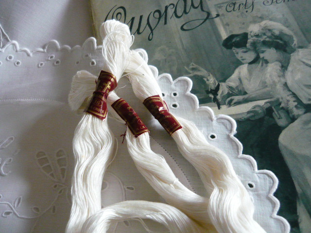 Mercerie ancienne idéale pour la broderie blanche, jours, bourdon, Richelieu, feston, point de plumetis, monogramme sur linge ancien ou tissu moderne. Fil à broder, recommandé pour broder le linge de maison