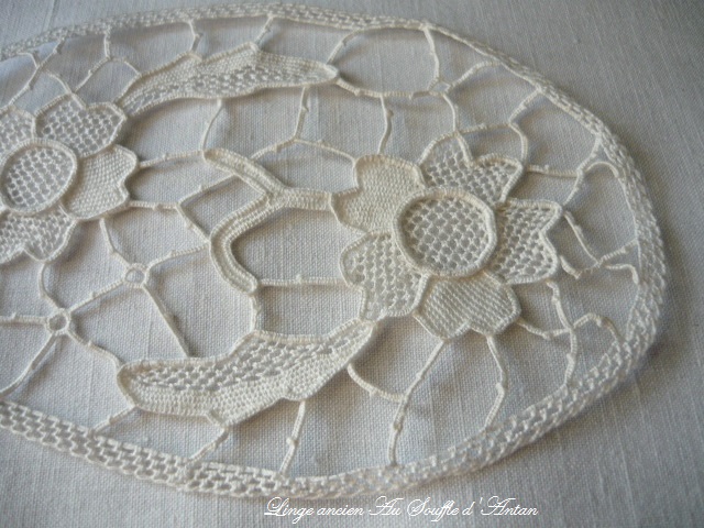 Cette incrustation ancienne au point de Venise est faite à la main.. Etat du neuf.