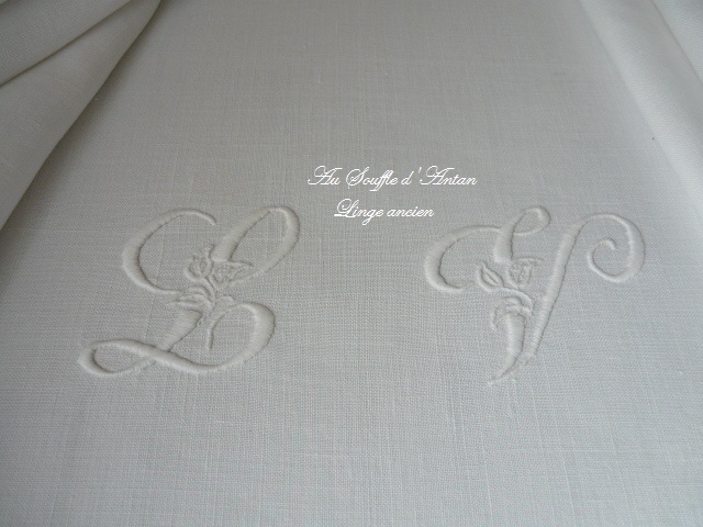 L V belles lettres brodées à la main linge ancien lin blanc bordure drap
