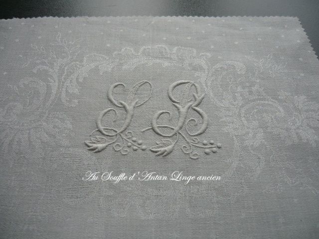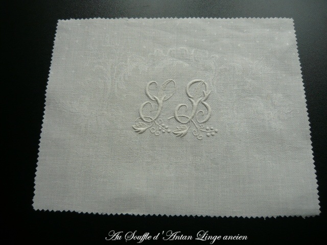 L'un d'une partie de serviette de table en damassé de lin blanc cassé, les 2 lettres 9 cm x 6.5 cm de hauteur sont soulignées d'un rinceau de vigne sur un support de 28 cm x 22 cm de hauteur.