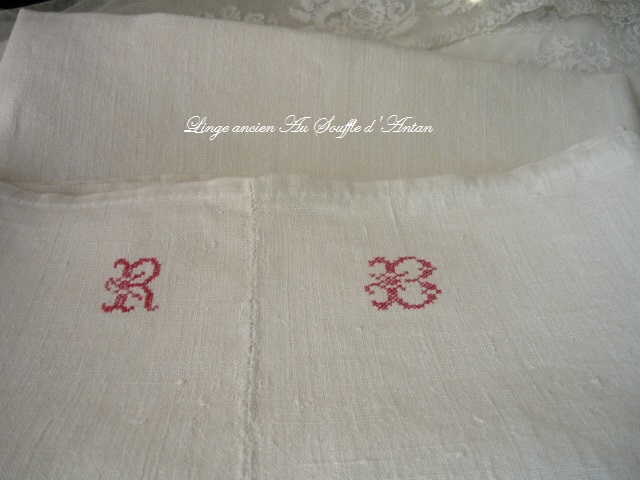 A une extrémité un monogramme ancien R B broderie ancienne de couleur rouge qui se compose de lettres brodées à la main aux points de croix.